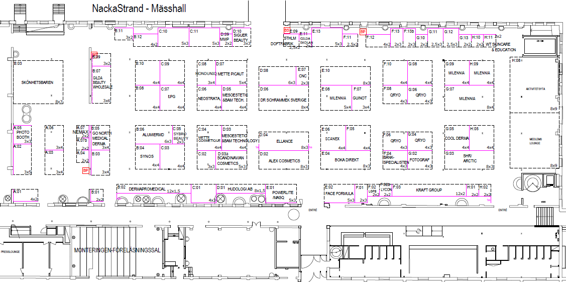 Hallskiss för 2026, Nacka Strand - hallskissen uppdateras löpande för Nacka Strandsmässan. För 3D visning av lokalen, gå in här. För senaste uppdateringen, kontakta projektledare Linn Rojas Ribbhagen.